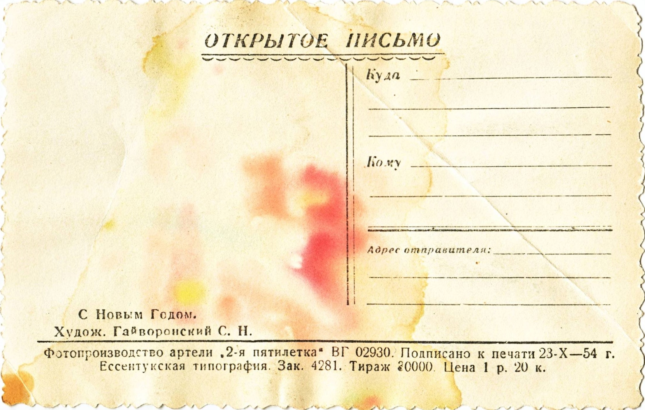 Открытка "Новым Годом".Художник Гайворонский С. Н., Фотопроизводство артели "2-я пятилетка", Ессентукская типография, Цена 1 р. 20 коп.