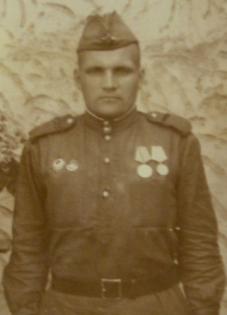 (1913-1990) на фронте с первого дня войны.Артиллерист-зенитчик.Участник обороны Заполярья,в составе 186 азенап Карельского фронта,затем в составе 2 Белорусского фронта воевал в Восточной-Пруссии ,в Восточной -Померании . За проявленную отвагу и мужество в боях с врагом награждён медалями :"За отвагу","За оборону советского Заполярья"," За победу над Германией",орденом отечественной войны ll степени ,а также Знаками "Почёта",и "отличник ПВО" ,многими юбилейными наградами